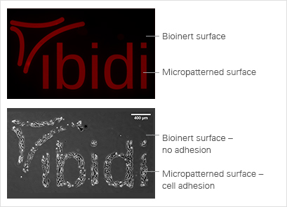 A sejtek letapadását elősegítő foltok mérete akkora, hogy egy ponton egy sejt tudjon kitapadni (µ-Slides µ-pattern Single Cell: 20 µm RGD motívum foltok, egymástól 110 µm távolságra), illetve a µ-Slides µ-pattern Multi Cell esetében akkorák (100 µm RGD motívum foltok, egymástól 500 µm távolságra) hogy sejtaggregátumot/szferoidot le tudjon horgonyozni.