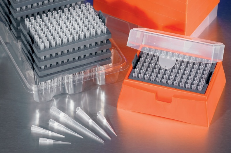 Átlátszó tálcákba előre csomagolt helytakarékos pipettahegyek. Környezettudatos megoldás: míg a hegyek orvosi tisztaságú polimerből, a rackek, dobozok 100%-ban újrahasznosított polipropilénből készülnek.